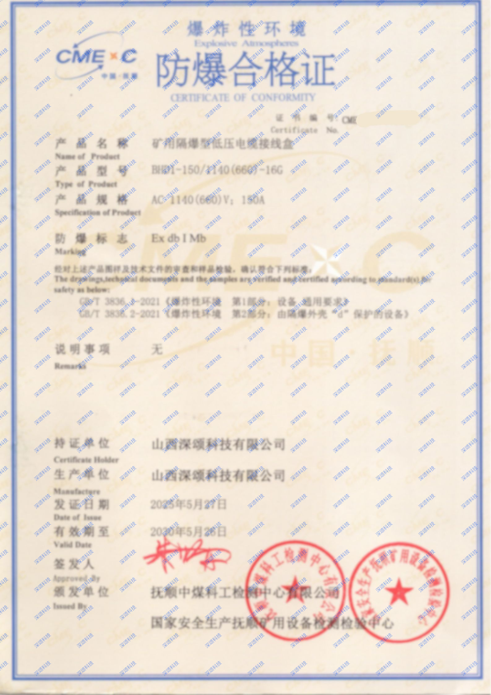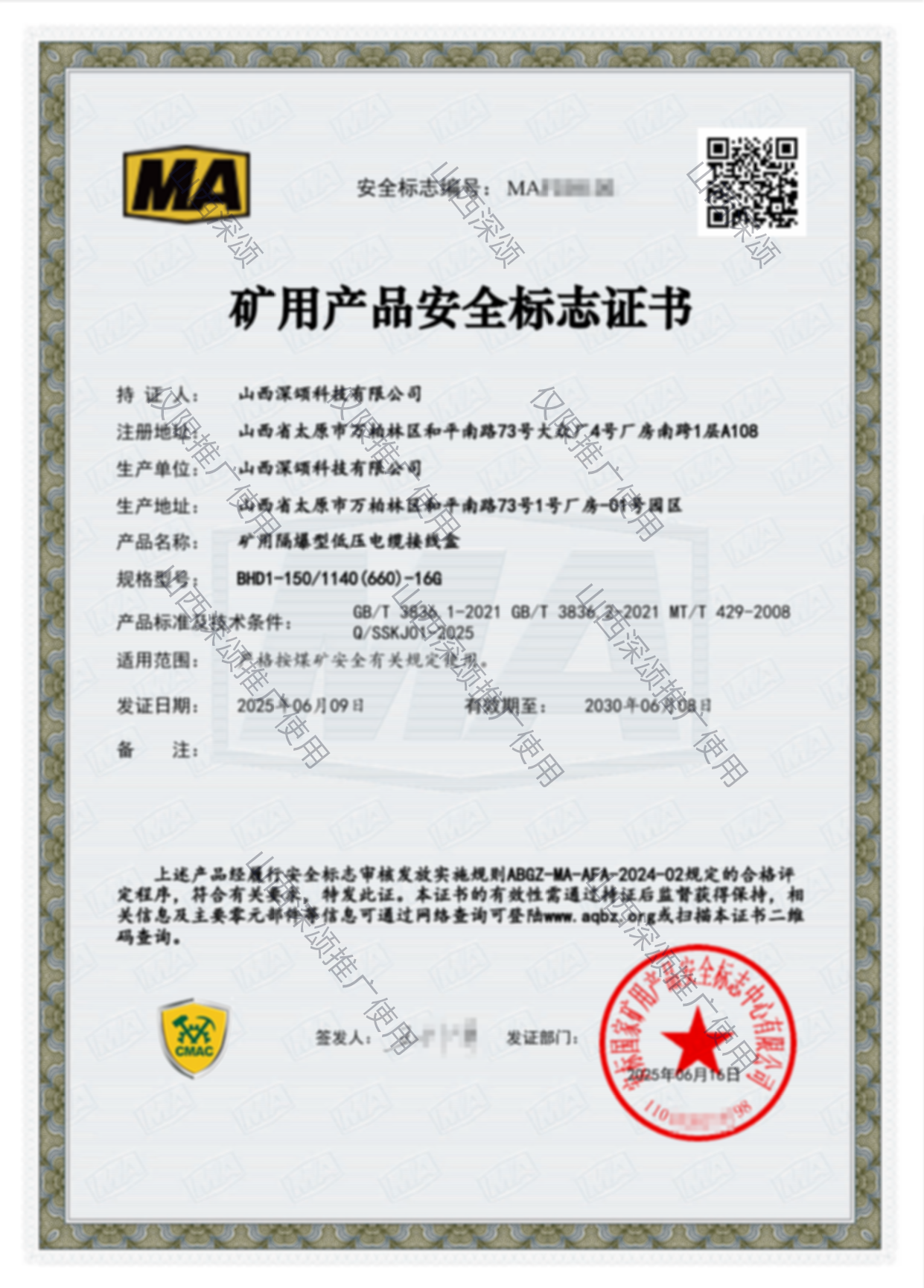 我公司已取得矿用隔爆型低压电缆接线盒防爆合格证和安全标志证书。